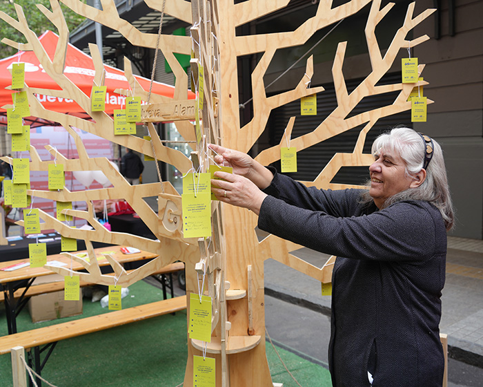 El evento contó con una atracción muy especial: el Árbol de la Nueva Alameda, donde los asistentes podían dejar sus deseos e ideas sobre cómo sueñan con que sea la ciudad del futuro, contribuyendo así a una visión colectiva de un Santiago más amigable y sostenible.